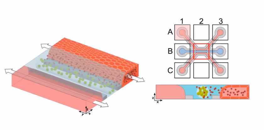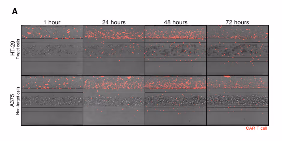 Solid tumors remain a major challenge for CAR T cell therapy due to limited infiltration, heterogeneous antigen expression, and therapy-induced toxicity. To study how CAR T cells reach and engage solid tumors, MIMETAS scientists developed an on-chip model to evaluate CAR T cell migration and killing capacity. ECM-embedded colorectal cancer (CRC) cells were incorporated into a model comprising endothelium and T cells. CAR T cells were perfused through the human endothelial vessel adjacent to ECM-embedded tumor cells (Figure 1).