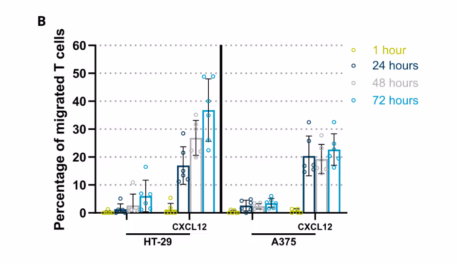 CAR T cells were perfused through a human endothelial vessel adjacent to ECM-embedded tumor cells, enabling assessment of vascular adhesion, transendothelial migration, and tumor infiltration. CAR T cell infiltration increased over time and was strongly enhanced by a CXCL12 chemokine gradient, indicating active and directed migration (Figure 2A). CAR T cells infiltrated both target and non-target tumor cell compartments. Quantitative analysis revealed distinct infiltration dynamics between these conditions, with differences in the fraction of CAR T cells entering the tumor compartment over time (Figure 2B). These results demonstrate that CAR T cell trafficking is influenced by tumor context and is not solely determined by target recognition.