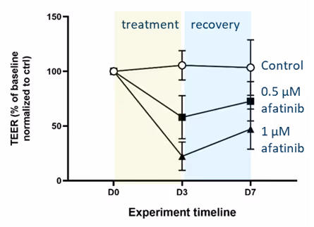 Many drugs impair gut barrier integrity either directly, by disrupting cell–cell adhesion, or indirectly through cytotoxic effects. Real-time TEER measurements, obtained using the OrganoTEER® device, in the OrganoReady Colon Organoid enable robust, dose-dependent assessment of drug-induced barrier disruption as well as subsequent recovery (Figure 2).