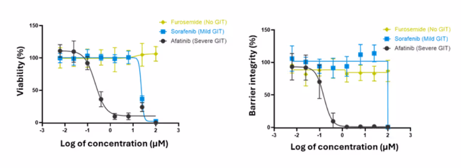 - Predictive and robust GI safety performance: The model demonstrates 75% sensitivity and 100% specificity for clinically GI-toxic drugs, confirmed through real-time barrier integrity (TEER) and cell viability measurements.
