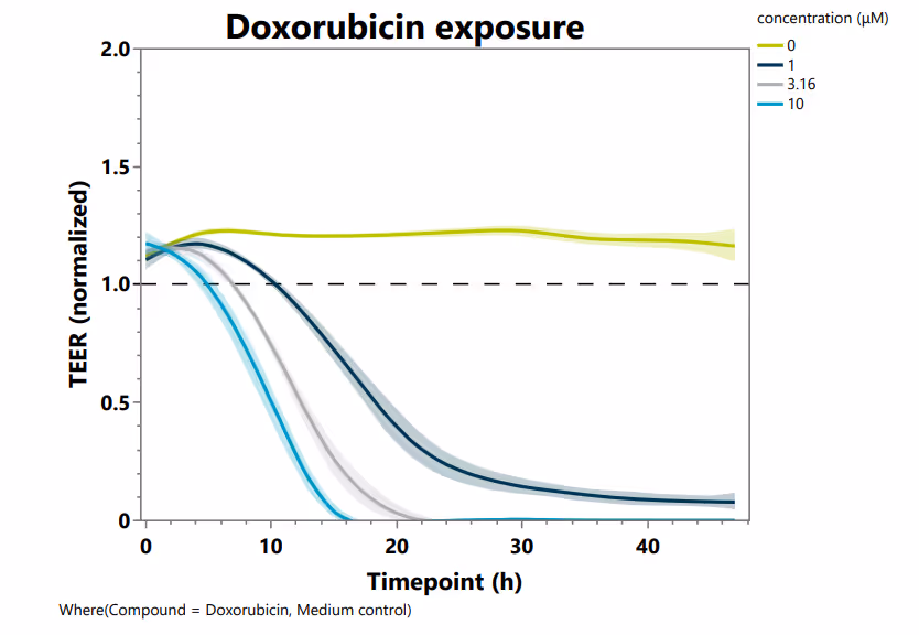 The model delivers a strong dose-dependent toxicity profile after doxorubicin treatment, captured through real-time transepithelial/transendothelial electrical resistance (TEER) measurement (Figure 2A). Cytokine treatment also triggers a significant, dose-dependent upregulation of ICAM-1, confirming robust and physiologically relevant endothelial activation (Figure 2B).