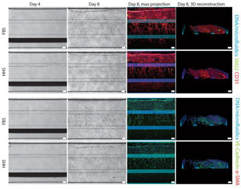 Most experimental systems used to study angiogenesis in SSc rely on animal models that do not always translate to human condition, are ethically problematic and are costly. Importantly, most cell culture models use fetal bovine serum which is not physiologically relevant. Traditional 2D in vitro models have limited throughput and demonstrate short-term stability of the capillary-like structures; these models also do not recapitulate the typical hallmarks of endothelial cells during angiogenesis in vivo such as lumen formation and differentiation into tip and stalk cells.