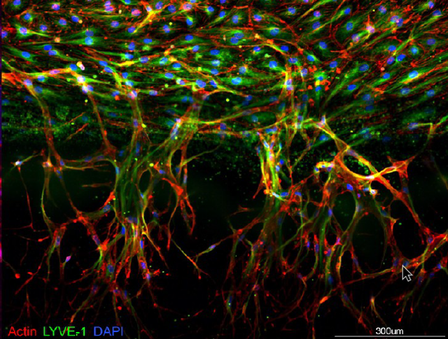 In this publication, a new lymphatic endothelial cell line is introduced with an elongated lifespan of over 12 months, with increased growth potential and decreased senescence. These cells were subsequently used to develop an organ-on-a-chip model in the high throughput MIMETAS OrganoPlate® 3-lane 40. The resulting 3D tissues presented as perfusable vessel-like structures grown against an extracellular matrix without any artificial membranes. Lymphangiogenesis could be observed by the addition of a gradient of lymphangiogenic factors. When co-cultured with mouse colon cancer organoids, the 3D tissue model resulted in a stable and long-lived system that can be used to study cancer-induced lymphangiogenesis and cancer cell motility.