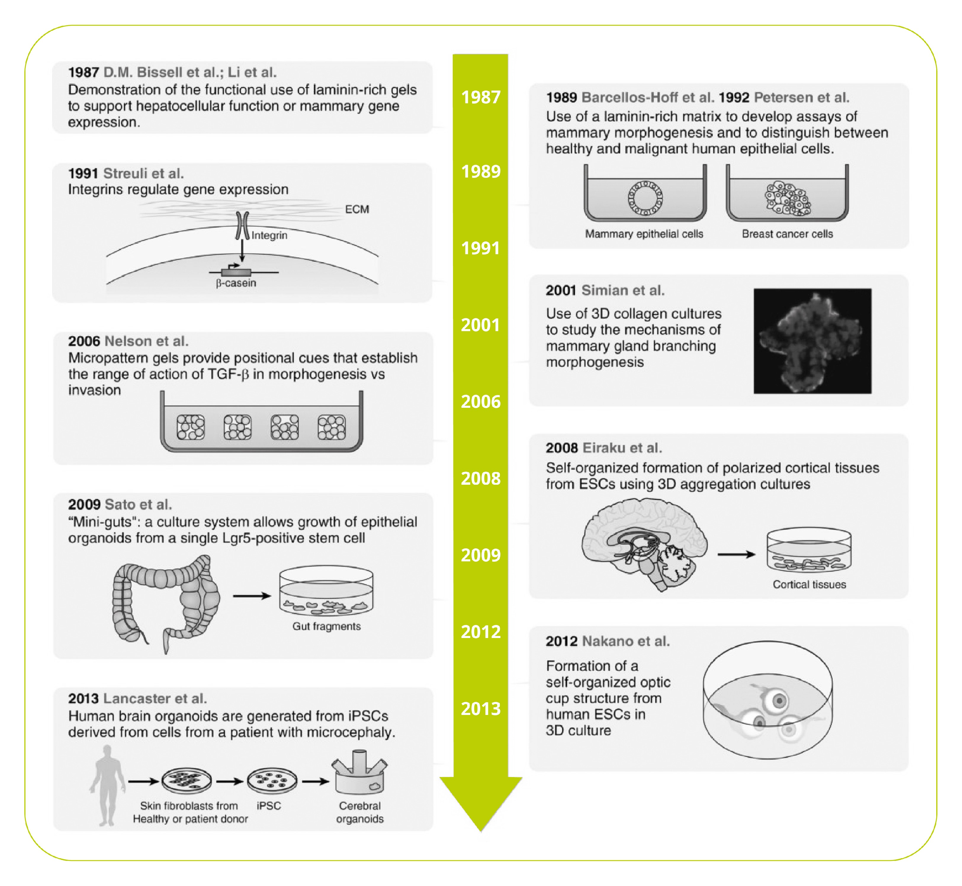What is 3D Cell Culture?The function of a tissue is determined 1. Simian, M. and Bissell, M. J. Organoids : A historical perspective of thinking in three dimensions by both its cellular and non-cellular composition. The more closely a cell culture system can replicate those conditions, the more closely those cells will replicate the behaviors and responses of cells in the body. This makes 3D cell cultures appealing.Cells in vivo experience a complex, three-dimensional environment that exposes them to circulating molecules, neighboring cells, and the extracellular matrix (ECM). With these environmental cues in mind, biologists have developed more physiologically accurate methods for culturing cells and tissues, including new media formulations and co-culture techniques. Back in the early days of cell culture, it was all we could do to keep cells alive and growing. Now, we have more ambitious goals – keeping cells alive, growing, and behaving just as they do in the body.3D cell culture represents yet another step towards this goal by focusing on mimicking normal cell-matrix and cell-cell interactions. Along with microfluidic or organ-on-a-chip systems, 3D cell culture offers researchers an unparalleled ability to recreate physiological compositions andspatial arrangements of cells in vitro.A Brief History of 3D Cell CultureWe think we’re made of cells, but they are far from the whole picture. In fact, by mass, the most abundant proteins in our bodies are ECM proteins – the nonliving material outside of our cells that provides a physical scaffold, barrier, and mechanical and biological signaling.However, that last role was underappreciated until the isolation of ECM proteins in the 1960s and 70s. These newly available materials led to compelling evidence that the physical cellular environment is far from inert, but acts as a biological and mechanical signal to regulate cell-type specific function, differentiation, and morphology1.Since then, remarkable progress has been made in 3D cell culture, including organoids, miniature organ-like structures that self-organize in 3D culture. Additional advances in technology, including microfluidics and engineered synthetic ECM hydrogels, have furthered our understanding of the mechanical and microenvironmental cues that govern cell behavior2,3.Why 3D Cell Culture?2D vs. 3D Cell CultureSimple, inexpensive, and reproducible, traditional or 2D cell culture is the mainstay of biological research. Meanwhile, 3D cell culture systems feature increased complexity for increased faithfulness to the in vivo environment. The primary changes to cells in 3D are rather obvious – shape, motility, and polarity are all affected – but can have important secondary, less-obvious tissue-specific consequences.2D 3DHigh stiffness surfaces provide supraphysiological mechanical signals Tunable, relatively low stiffness environment closer to that of tissuesContinuous, flat surface available for unencumbered adhesion, spreading, and migration Nano- and micro-scale 3D surfaces provided by ECM fibers and matrix porosity guide and hinder cell motilitySoluble gradients absent without microfluidics Gradients of soluble factors, nutrients, and oxygen based on diffusion through gel or cell aggregates2D geometry constrains morphogenesis and cell-substrate interactions dominate Free to self-organize in 3D. In multicellular structures, cell-cell interactions dominate.Automatic apical-basal polarization Embedded cells generate apical-basal polarity on their ownAdhesive, topographical mechanical and soluble cues in 2D and 3D4A lot changes when a cell moves from 2D to 3D culture, but the most obvious is the mechanical environment. The stiffness of glass or plastic is multiple orders of magnitude higher than that seen in soft tissues, which have a consistency like Jell-O or cream cheese. Stiffness directly affects cell adhesion, spreading, migration, and differentiation. The mechanics of 3D cell culture, on the other hand, are quite different. ECM gels feature lower stiffnesses, local structures like collagen fibers, and pores that encumber migration and invasion. ECM proteins are also readily remodeled by the cells themselves by fiber bundling and degradation. Together, these can lead to reduced proliferation, altered migration, smaller and more distributed focal adhesions, and directional cell elongation along fibers.The 3D gel itself is capable of sequestering biomolecules and4. Baker, B. M. and Chen, C. S. Deconstructing the third dimension – how 3D culture microenvironments alter cellular cues. J. Cell Sci. 125, 3015–3024 maintaining concentration gradients of soluble factors. For example, the protein aggregates of late-stage neurodegenerative disease are more apparent in 3D than traditional cell culture, where secreted proteins diffuse freely into the culture medium rather than accumulate near cells5,6. In addition, many growth factors are known to bind to ECM proteins. These sequestered growth factors can create concentration gradients that guide stem cell differentiation and morphogenesis during development in vivo7. By contrast, the liquid medium in traditional 2D cell culture does not allow for the storage and release of growth factors and concentration gradients.Finally and most visibly, cells in 3D culture can create 3D structures, rather than being constrained to a single layer in 2D. Many outcomes in morphogenesis and development are three-dimensional, like branches, hollow spheres, tubes, and vascular networks. In multicellular aggregates, the increased dimensionality also allows for increased cell-cell interactions. The functional consequences are evident in cell-dense systems like the liver, where interactions with non-parenchymal cells contribute significantly to hepatocyte function8, and muscle, where spontaneous contractions can be coordinated across all the cells in a microtissue9. Spheroids are a scaffold-free variant of 3D cell culture where aggregated cel