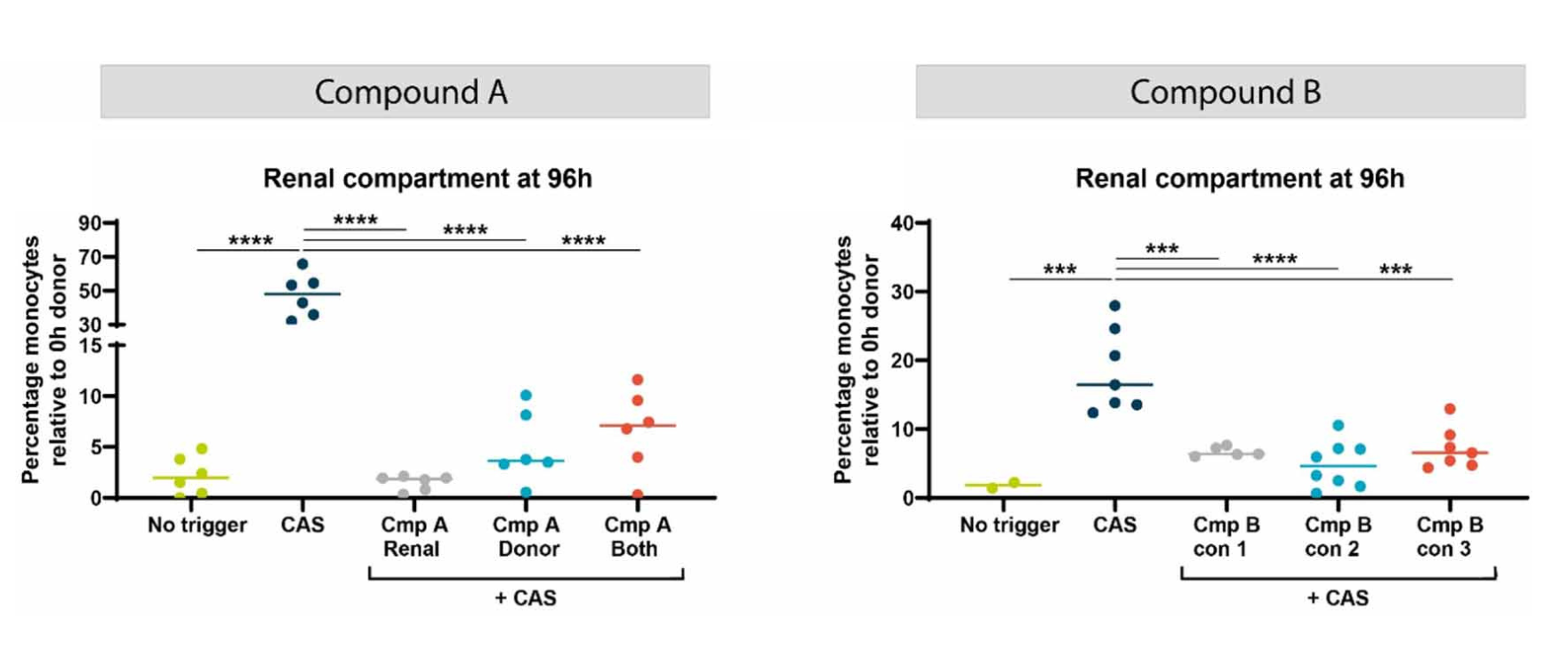 Figure 4. Percentage of monocytes present in the Renal compartment after exposure CAS + compound A or B respectively after 96h. Compound A targets the inflammatory trigger and Compound B targets the monocytes directly. Different exposure strategies were applied based on compound characteristics.
